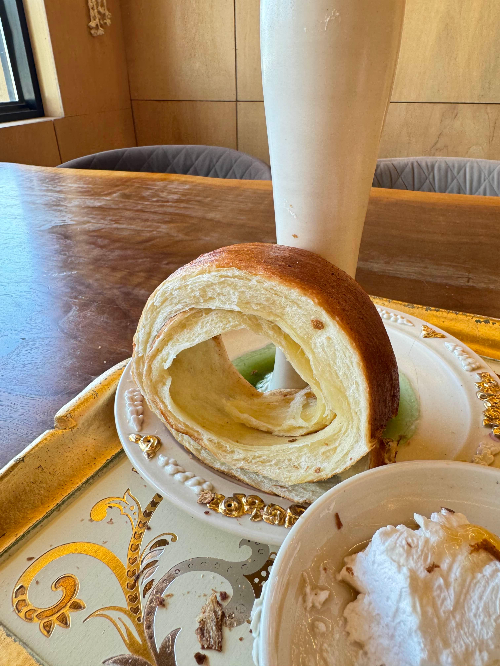 굴뚝빵, 생크림, 아이스 컵을 전부 도자기 그릇으로 사용하는데요.